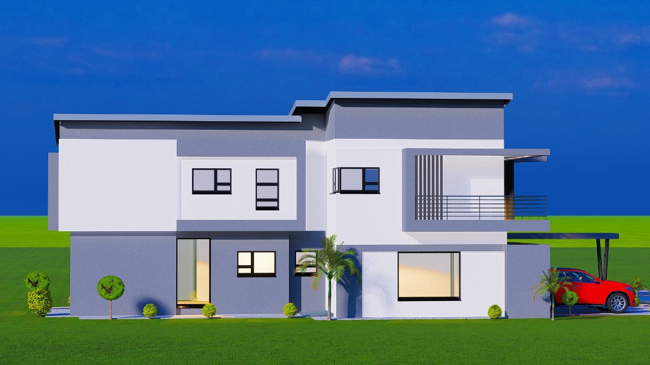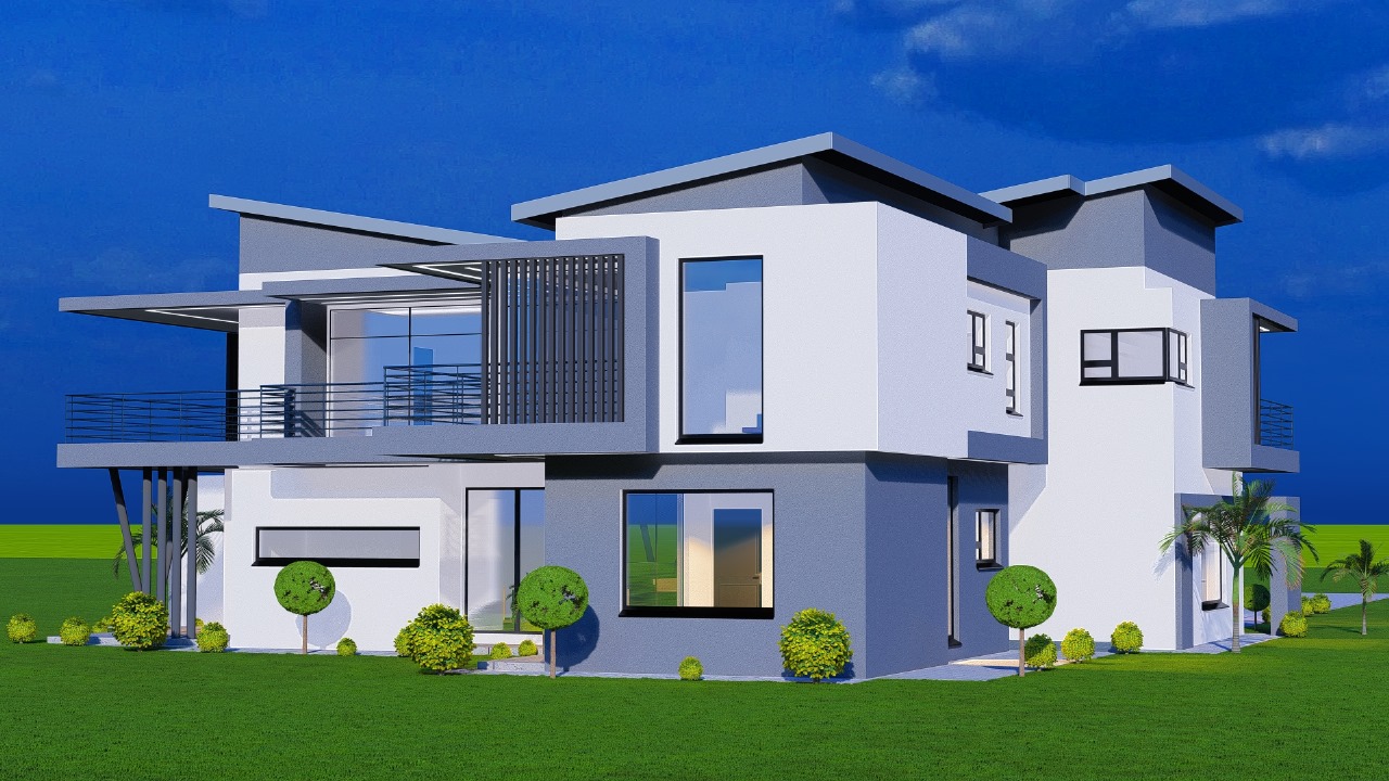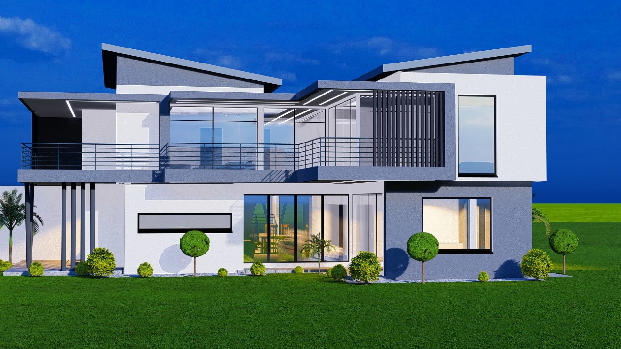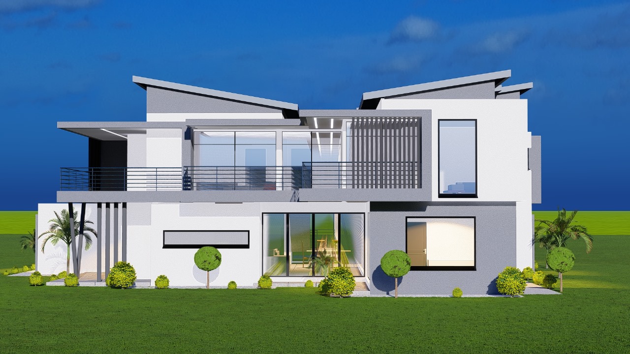 Striking double-story modern home featuring bold architectural lines and premium contemporary design. This luxury villa showcases dynamic rooflines, expansive glass facades, and sophisticated balcony details with sleek horizontal railings creating dramatic visual impact.
