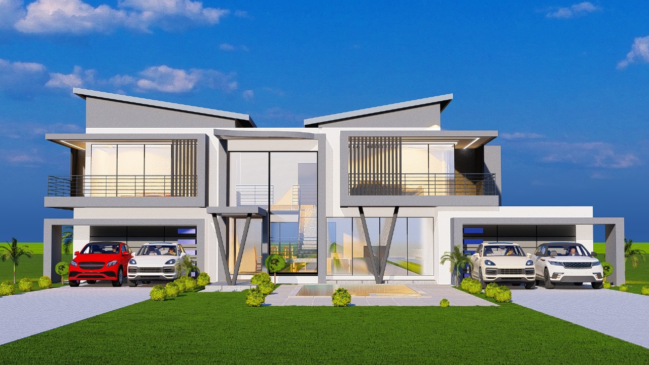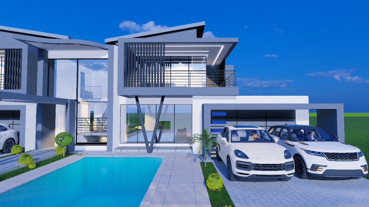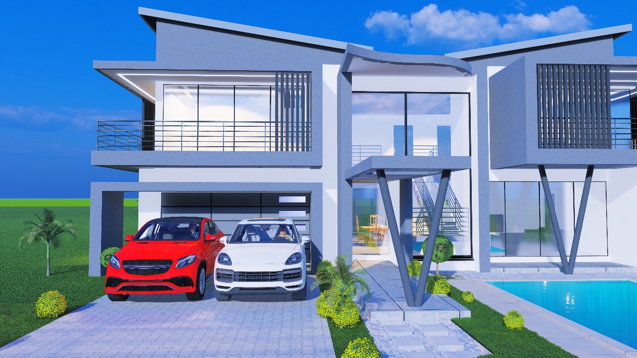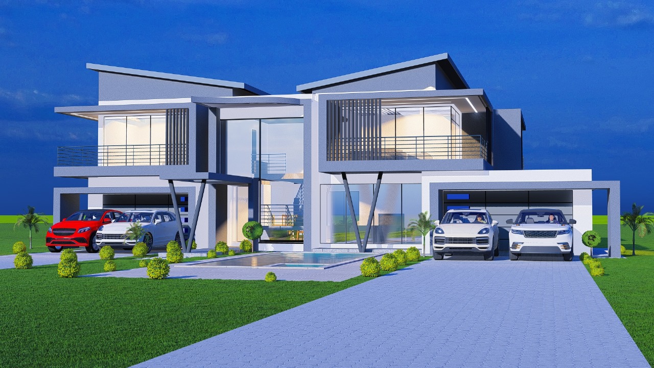 Striking double-story modern home featuring bold architectural lines and premium contemporary design. This luxury villa showcases dynamic rooflines, expansive glass facades, and sophisticated balcony details with sleek horizontal railings creating dramatic visual impact.
