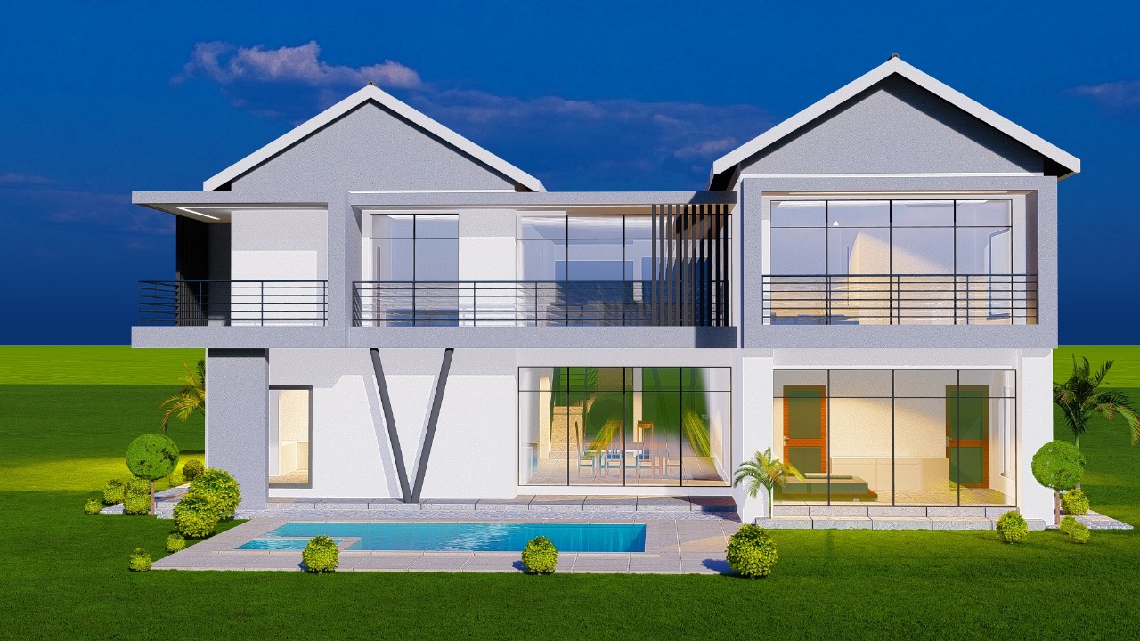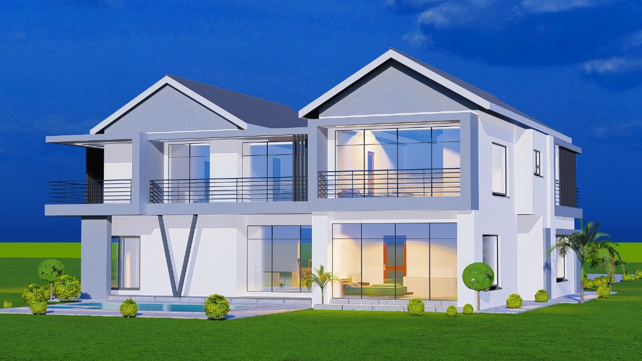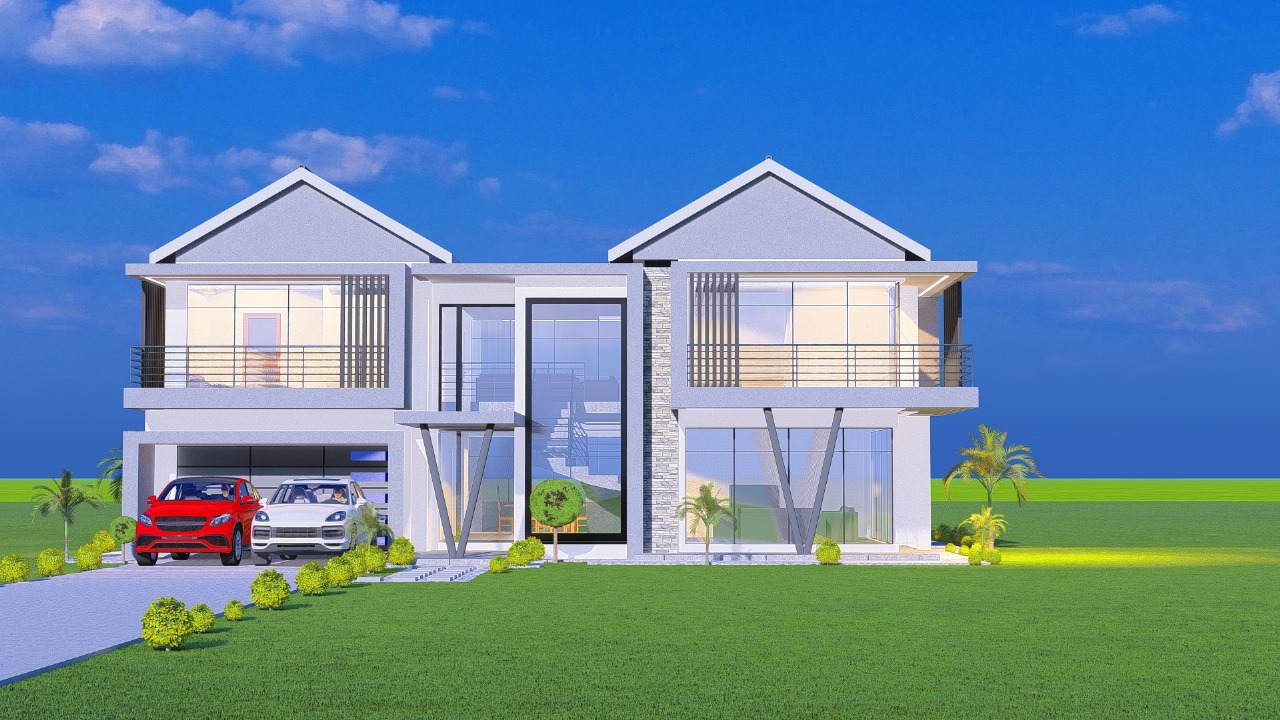 Elegant two-story modern house design featuring striking angular architecture and premium finishes. This luxury home showcases expansive glass facades, contemporary balconies with sleek railings, and distinctive geometric elements creating bold visual appeal.